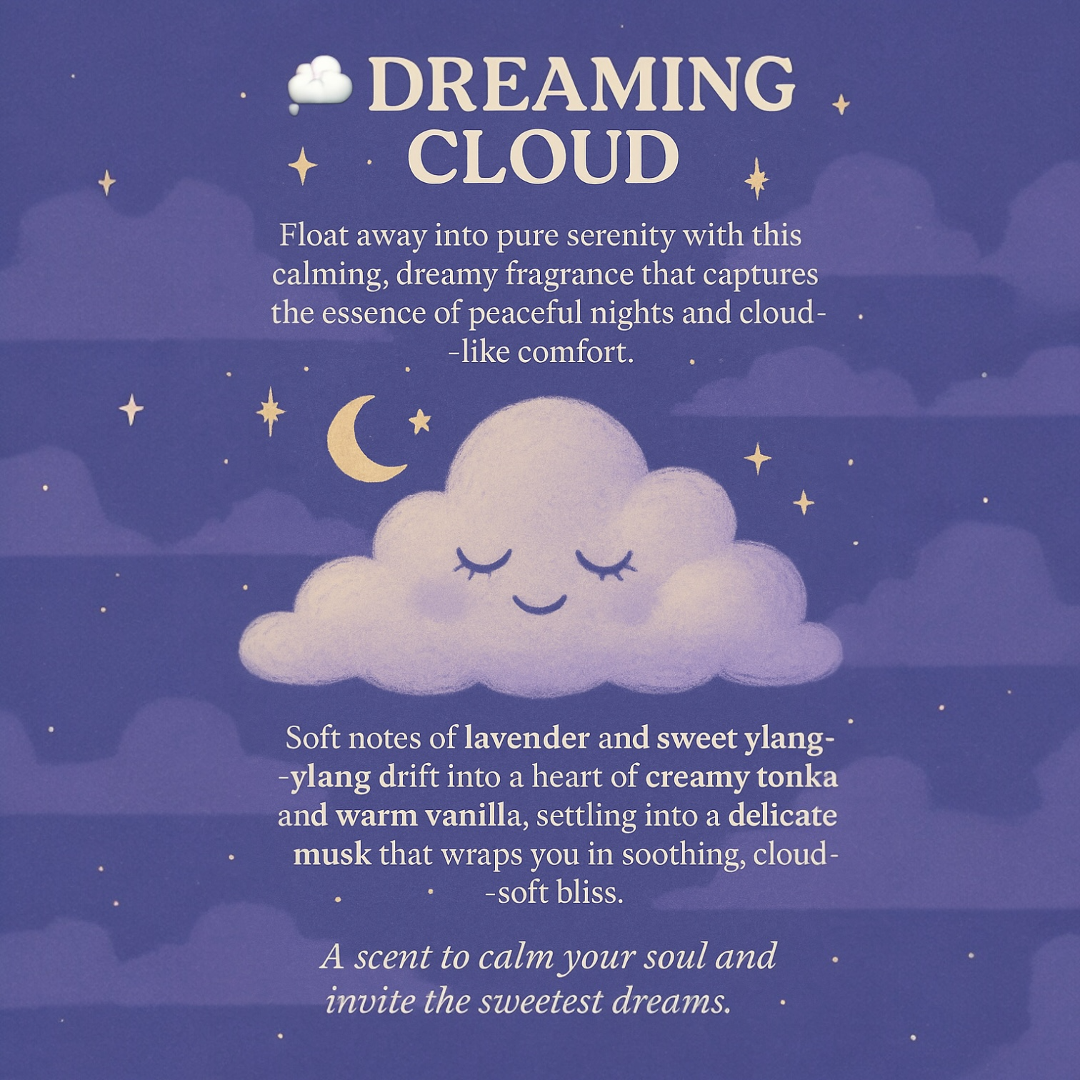 ✨ DREAMING CLOUD ✨a calming, dreamy fragrance that captures the essence of peaceful nights and cloud-like comfort. It opens with gentle lavender and sweet ylang-ylang, drifting into creamy tonka, warm vanilla and a soft hint of musk