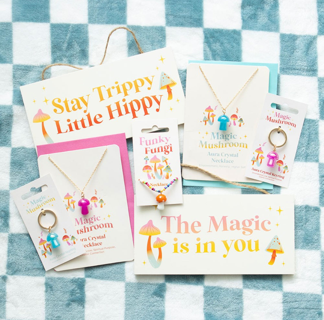 Send a little magic someone’s way with this vibrant pink crystal mushroom necklace card. 🍄💎✨ The aura crystal necklace symbolises unconditional love, spiritual purpose, and cosmic connection – a thoughtful keepsake they can wear close to their heart.