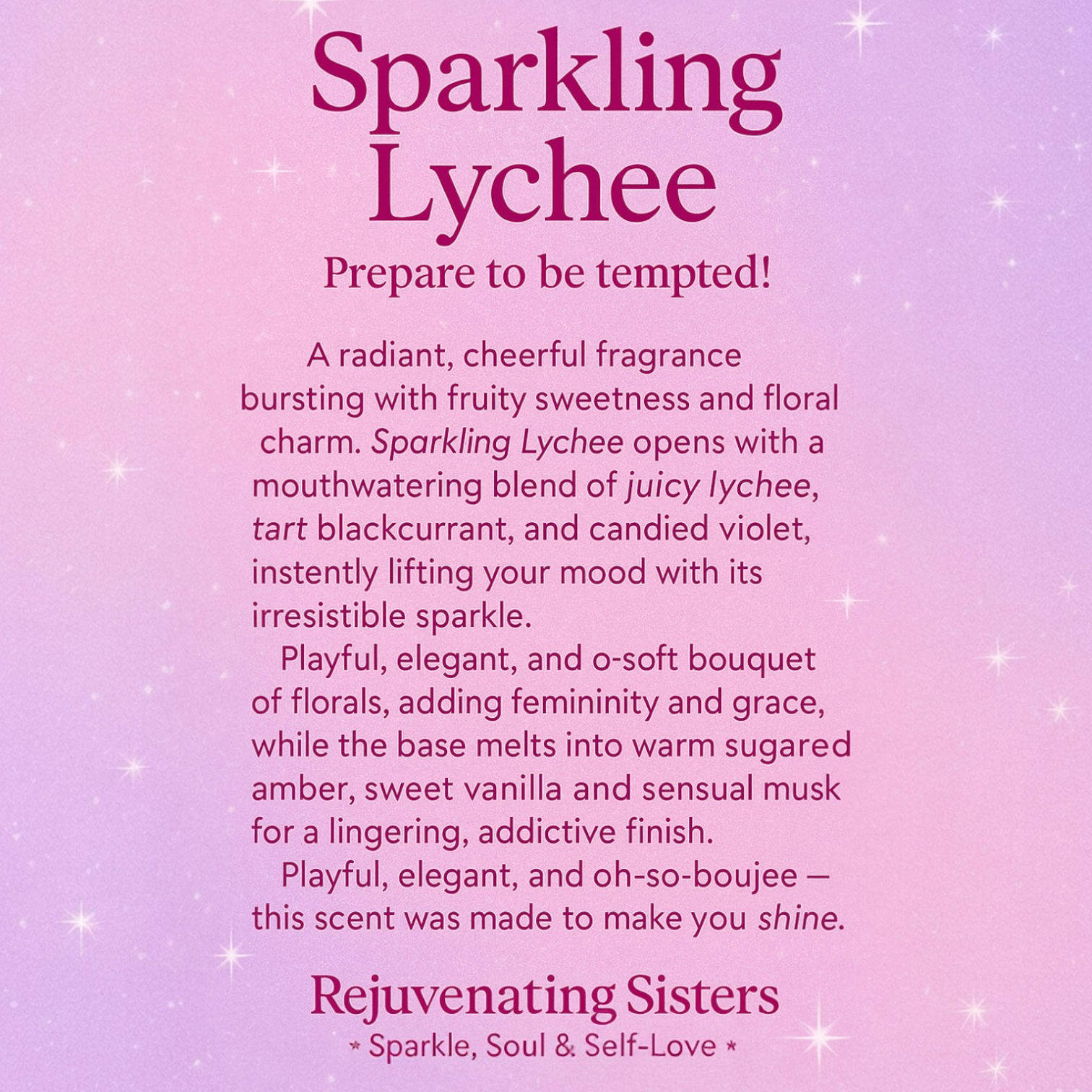 A radiant, cheerful fragrance bursting with fruity sweetness and floral charm. Sparkling Lychee opens with a mouthwatering blend of juicy lychee, tart blackcurrant, and candied violet, instantly lifting your mood with its irresistible sparkle.